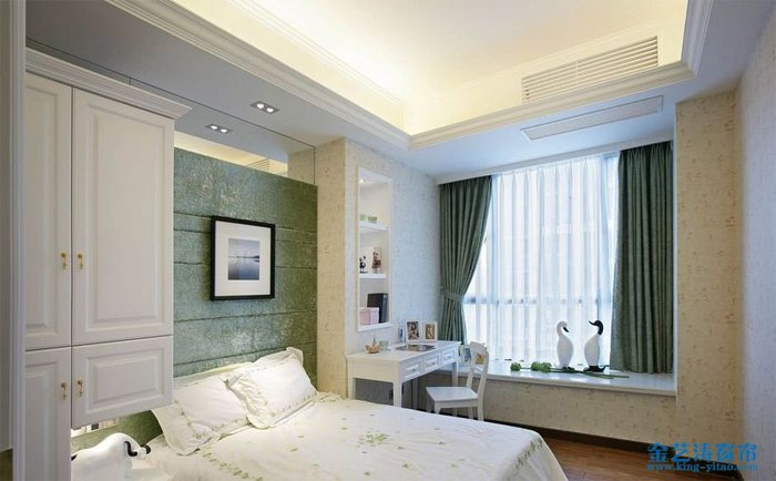 適合臥室小但有大飄窗的家庭。窗簾裝在飄窗里顯得臥室寬敞;里面頂裝,不占空間,還美觀。但如果你家里的飄窗面積小,做了則會(huì)感覺(jué)飄窗視覺(jué)效果太擁擠。